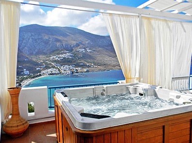 Two twin beds close together or one King bed to share. These rooms feature state of the art facilities in a minimal Cycladic design mentality and present a subtle, elegant and modern comfort. Enjoy the splendid view of the Aegean Sea from your private balcony.